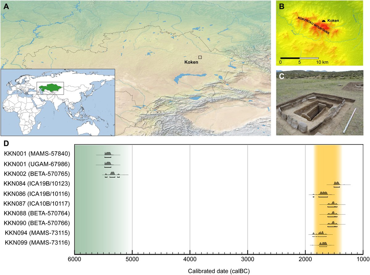 (A) Koken is a multiperiod site occupied since the Epipaleolithic in Abai region of eastern Kazakhstan (inset, green). The basemaps used in (A) are in the public domain and accessible through the Natural Earth website (naturalearthdata.com/downloads/10m-…; last accessed 3 March 2022). (B) Koken is situated in a semiarid steppe zone along the northern foothills of the Kokentau Mountains, and it falls within a biodiverse ecosystem of steppe grasslands, seasonal streams, birch and juniper groves, marshland, and mineral outcrops. (C) Excavation photograph of Burial 13 (KKBR13), a representative MLBA Andronovo culture cist grave surrounded by a stone fence containing the remains of individual KKN090. (D) Calibrated radiocarbon dates for individuals at Koken, showing 95.4% probability. The burials date broadly within the EN (green) and MLBA (yellow) periods. Dates were calibrated with OxCal v4.4.4 (99) using atmospheric data from Reimer et al. (55) (Photo Credit: P.D.D., Nazarbayev University).