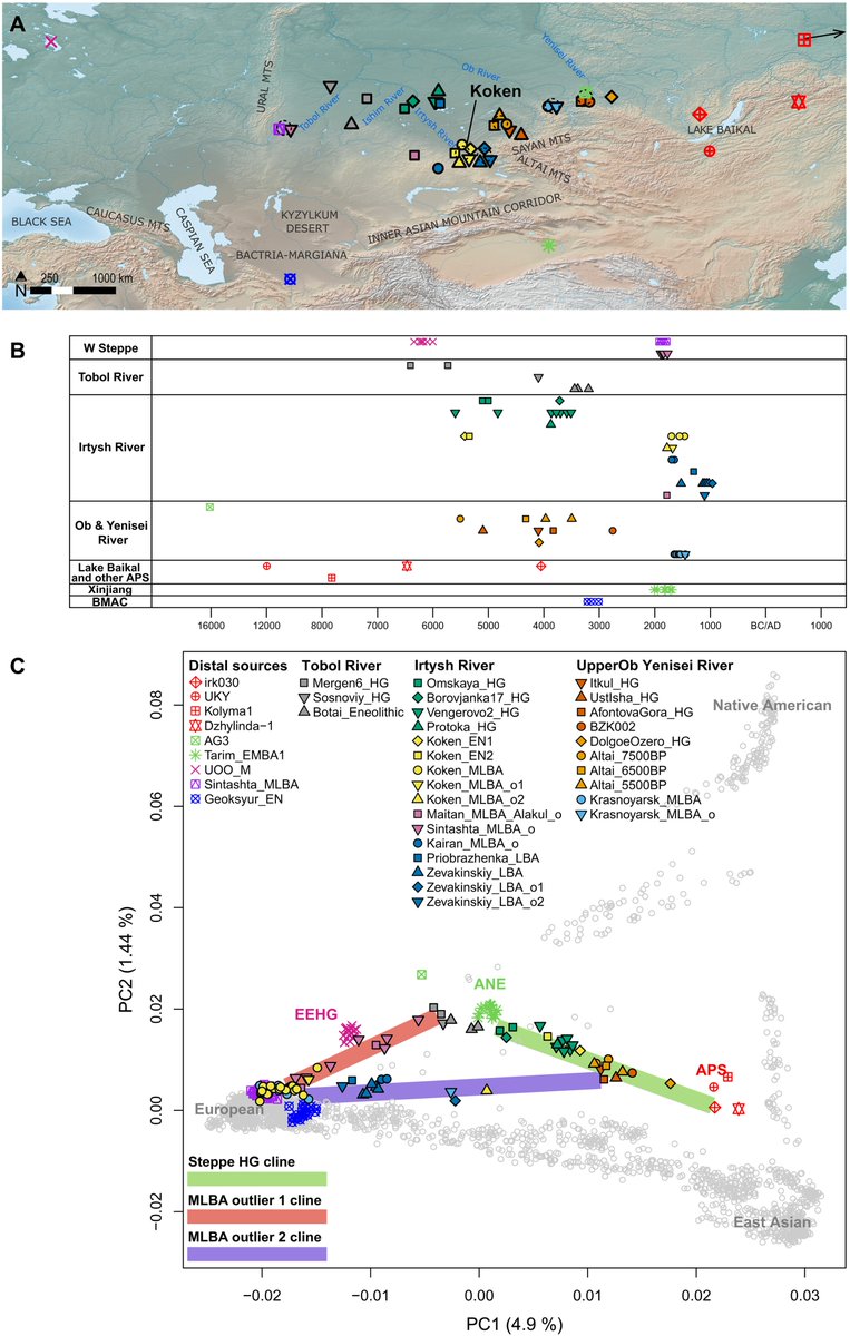 (A) Map showing locations of key ancient individuals whose genomes were analyzed in this study. The individual Kolyma_M lies beyond the geographic scope of the map; its approximate location is indicated by an arrow. The basemap used in (A) is in the public domain and accessible through the Natural Earth website (naturalearthdata.com/downloads/10m-…; last accessed 3 March 2022). (B) Radiocarbon dates of Koken and other ancient individuals analyzed in this study. BMAC, Bactria-Margiana Archaeological Complex. (C) Top two PCs were calculated from 2270 present-day Eurasian and American individuals. Gray circles mark present-day individuals used for calculating PCs. Ancient individuals, marked by color-filled symbols, were projected onto the calculated PCs. The green line marks the genetic admixture cline of prepastoralist steppe hunter-gatherers, stretching between the ANE and APS populations. The red and purple lines mark the distribution of MLBA genetic outliers, each suggesting a mixture with a distinct local population who resemble Tobol_HG (e.g., Mergen6_HG) and Irtysh_HG_2 (e.g., BZK002), respectively. Color-filled symbols used in (A) and (B) are listed in the legend in (C).