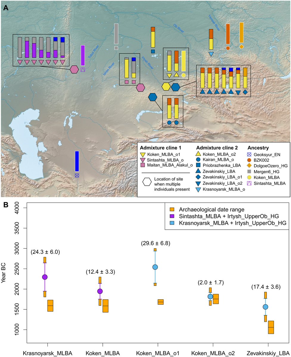 (A) QpAdm admixture models for MLBA outliers, using subsets of six source populations marked by color-filled symbols with gray outlines. The geographic locations of the modeled MLBA outliers were marked by the color-filled symbols or the color-filled hexagons (for sites with multiple individuals; for these, site location is indicated by a hexagon, and the corresponding individuals are bounded by a box). In most cases, the extra genetic ancestry in these outliers was modeled as a mixture of either Tobol_HG (e.g., Mergen6_HG) or UpperOb_HG (e.g., BZK002). The basemap used in (A) is in the public domain and accessible through the Natural Earth website (naturalearthdata.com/downloads/10m-…; last accessed 3 March 2022). (B) Admixture dates of MLBA groups estimated by DATES. The orange-colored rectangles represent the archaeological date range, set as the union of 95.4% confidence intervals of calibrated radiocarbon dates of individuals in each group. The color-filled circles and the associated vertical lines represent the admixture date estimates and ±2 SEM estimated by the leave-one-chromosome-out approach. The admixture date was marked from the center of the archaeological date range. Orange blocks attached to the top and bottom of the ±2 SEM intervals of the admixture dates correspond to the half of the archaeological date range to portrait the total uncertainty of the admixture date estimates.
