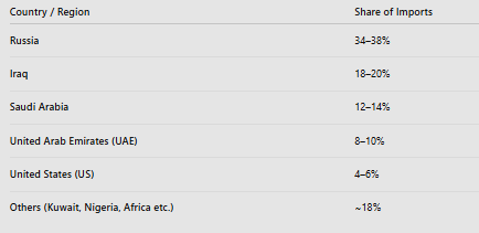 India is the world’s 3rd largest oil consumer and 2nd largest importer of crude. Because domestic production covers only 15% of its needs, India is heavily dependent on global suppliers.