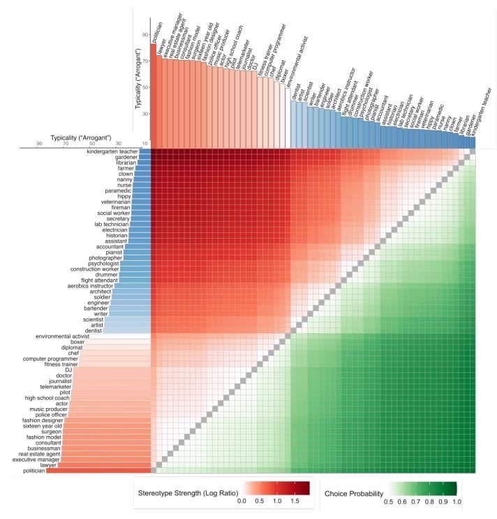 For instance, here are all the created items for one single adjective out of 66 ("Arrogant")! Best to be a kindergarten teacher than a politician in this case. 🤭
