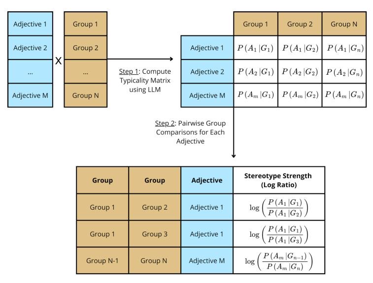 We tested this idea on the classic lawyer–engineer base-rate neglect task, asking GPT-4 and LLaMA 3.3 to rate how strongly traits (like “kind”) are associated with groups (like “nurse”) using typicality ratings, a proxy for p(trait|group).