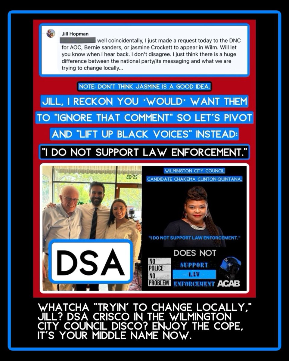 Ahead of their county convention a few months ago, NHC Dem Chair Jill Hopman commented on facebook that she wanted to bring DSA members Bernie Sanders and AOC--photographed just YESTERDAY in NY with radical Revolutionary Socialist police abolitionist Zohran Mandani--to Wilmington.
