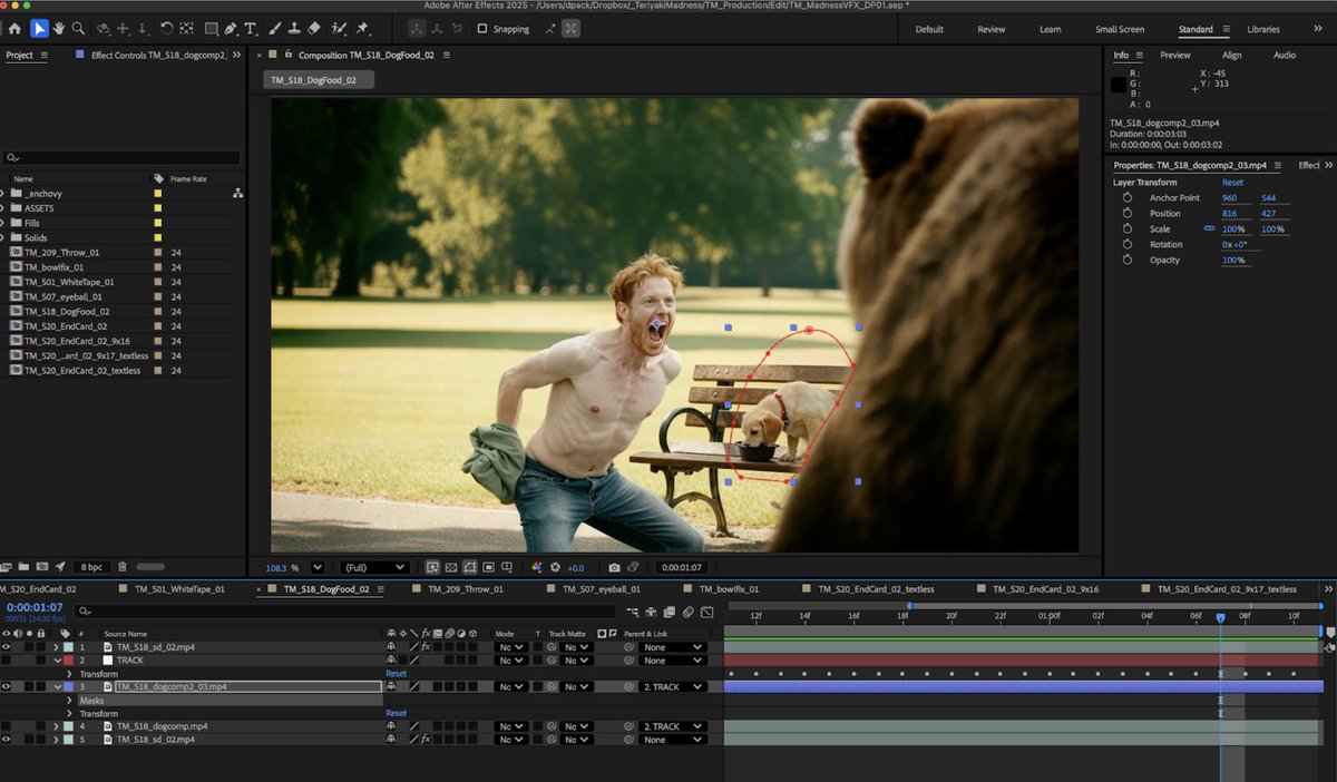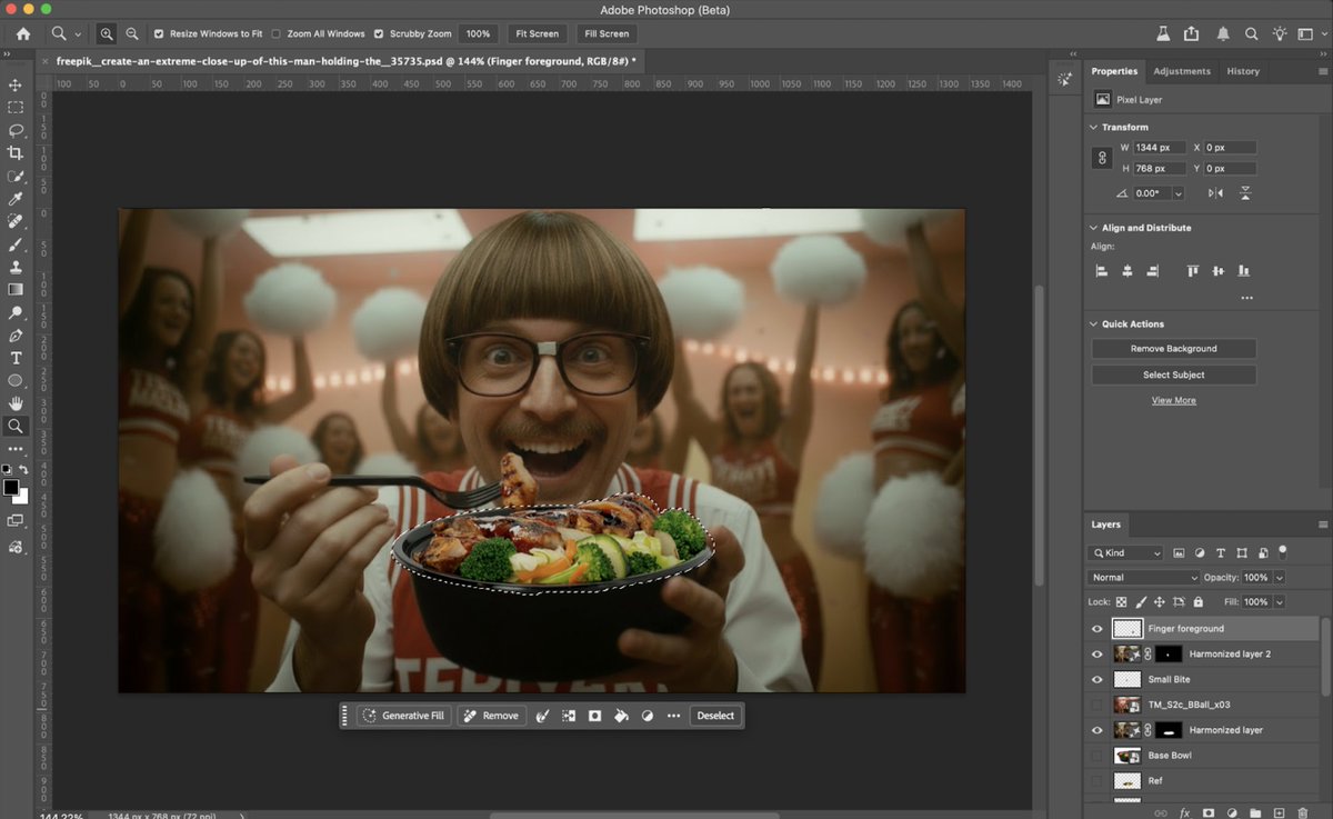 The client sent tons of food pics, and Dan built rotating video references to nail every angle. Photoshop Harmonize saved us big time!