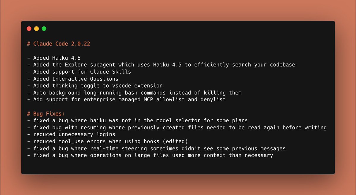 Besides Haiku 4.5, we added support for Claude Skills, gave Claude a new tool for asking interactive questions, added an ‘Explore’ subagent, auto-background long running tasks and fixed several bugs.