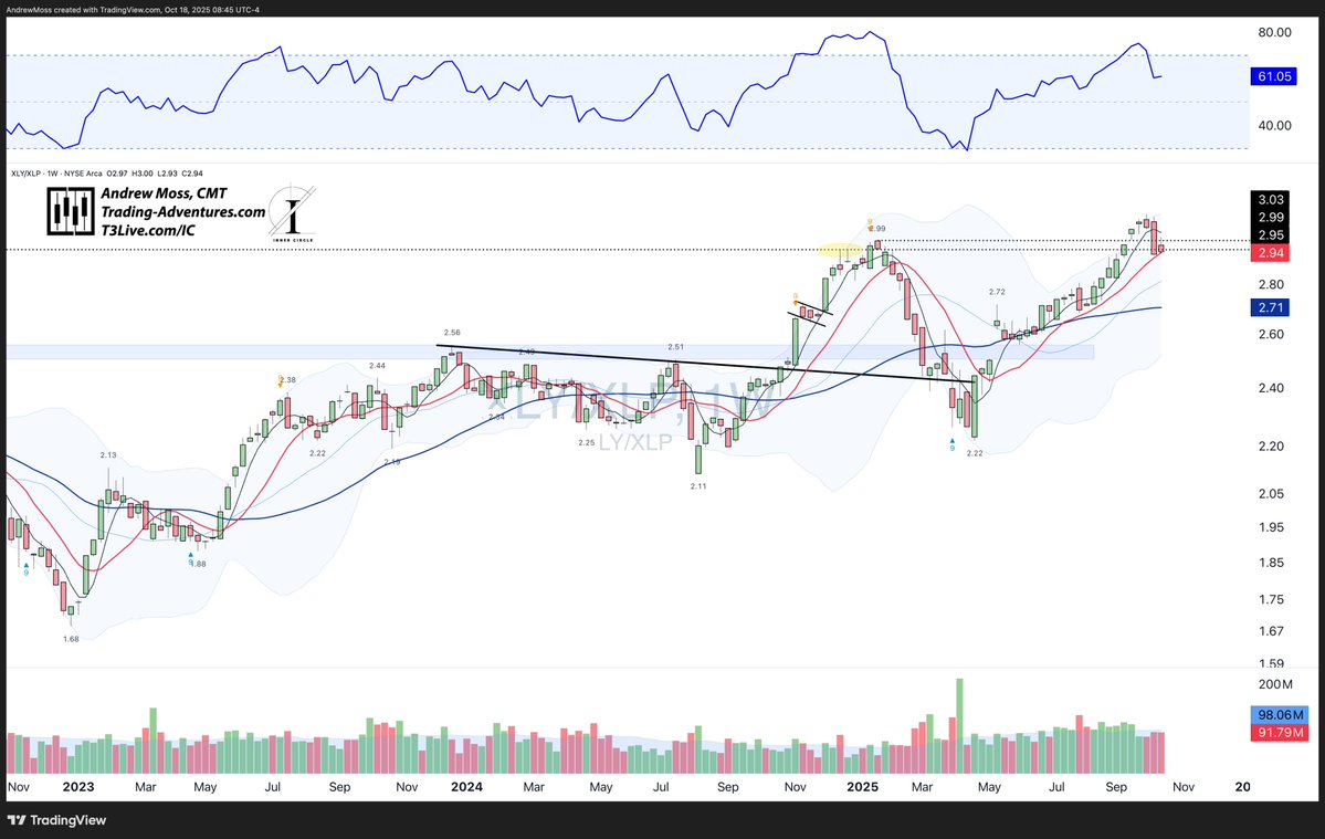 $XLY / $XLP – Inside week near 10-week MA and the lower end of last week's range.