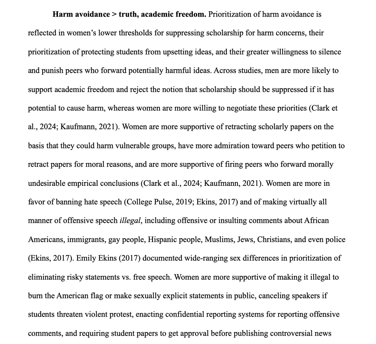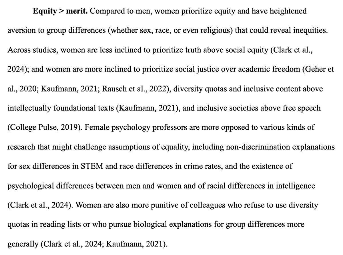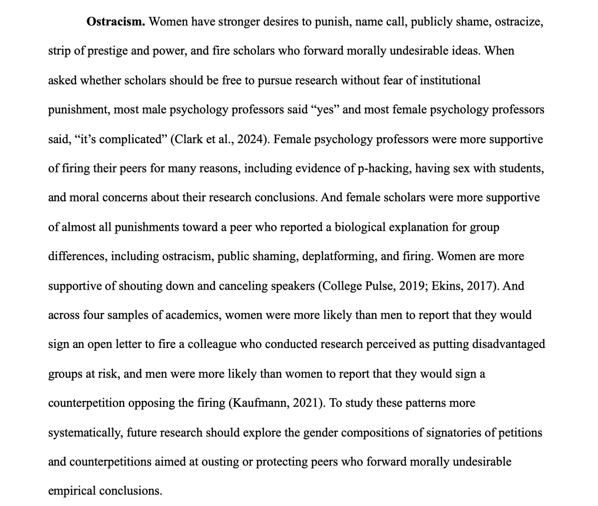 4. Multiple studies document these sex differences in academia. Women report more support for equity, social justice, diversity quotas, banning offensive speech and research, and punishing, ostracizing, and firing peers who forward “harmful” conclusions.