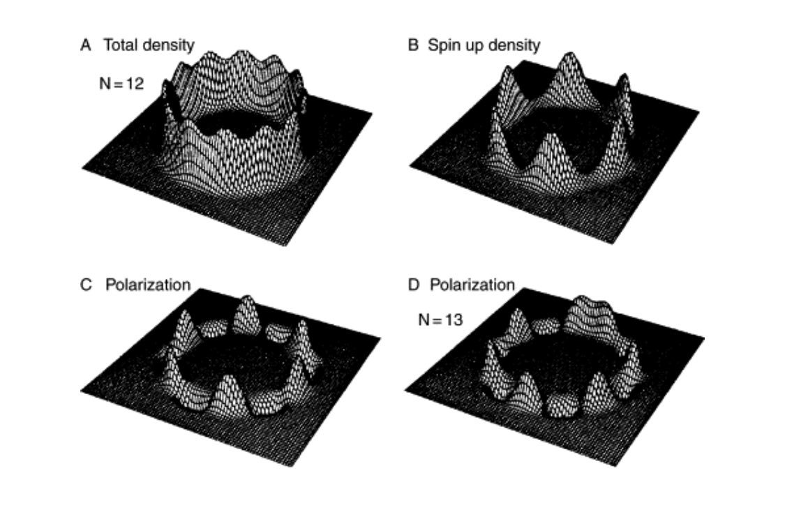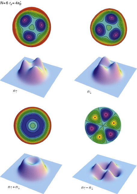 The self-consistent electronic structure calculations for quantum dots for some electron numbers showed internal symmetry-breaking of the spin-density [81], leading to a static “spin-density wave” (SDW). Figure 9shows, as an example, the intriguing ground-state spin polarization for a quantum dot with six electrons. For not too small densities of the electron gas, that is, rs ≤ 6a0∗, this quantum dot still has a closed-shell configuration, with S = Sz = 0. This result is obtained from spin-density functional theory (SDFT). The total density obtained by the SDFT method is circularly symmetric, with zero netpolarization (S = 0). However, the spin polarization (which equals the difference between the spin densities n↑ + n↓ normalized by the total density, n↑ + n↓), in standard SDFT breaks the azimuthal symmetry of the confinement, showing a regular spin structure. Figure 9 shows this very clearly for the example of a six-electron quantum dot at rs = 4a0. Both spin-up and spin-down densities exhibit three clear bumps, which are twisted against one another by an angle of π/3. This resembles very much an antiferromagnet-like structure, with alternating up- and down spins, on a ring. Such states were obtained both with the Tanatar–Ceperley [77] and the more recent Attaccalite–Moroni–Gori-Giorgi–Bachelet (AMGB) [83] functionals for exchange-correlation. As the AMGB functional depends explicitly on the spin polarization, there is left no doubt that the SDW states are not simply an artifact of the ad hocapproximation to the correlation energy, which is usually interpolated following the polarization-dependence of the exchange energy [81]. In quasi-1D quantum rings (see Section VII.B), these SDW states become more distinctive, as shown in Figure 10.
