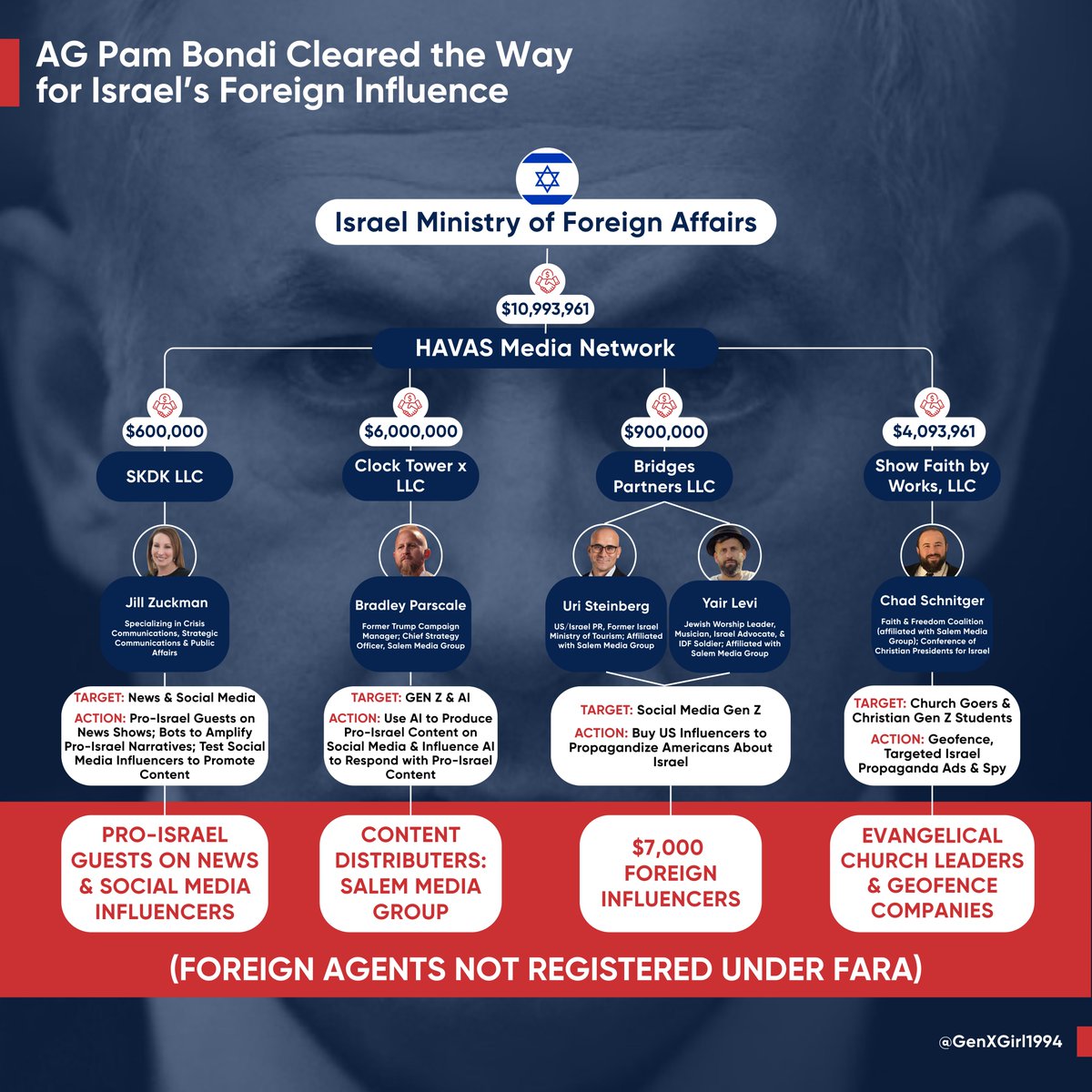 Since Pam Bondi has directed the DOJ to only prosecute individuals who fall under the definition of the Espionage Act from 1917 (123 years ago), FARA violations involving PR firms and nonprofits engaged in Israeli influence campaigns online and via social media & media have free reign to propagandize Americans. That also means, unregistered 1099 contractors and subcontractors will also not be prosecuted. Furthermore, the penalty for not registering (should this become an issue) is no longer criminal charges leading to 10 year prison sentences. It is a simple slap on the wrist and a reminder to register.
