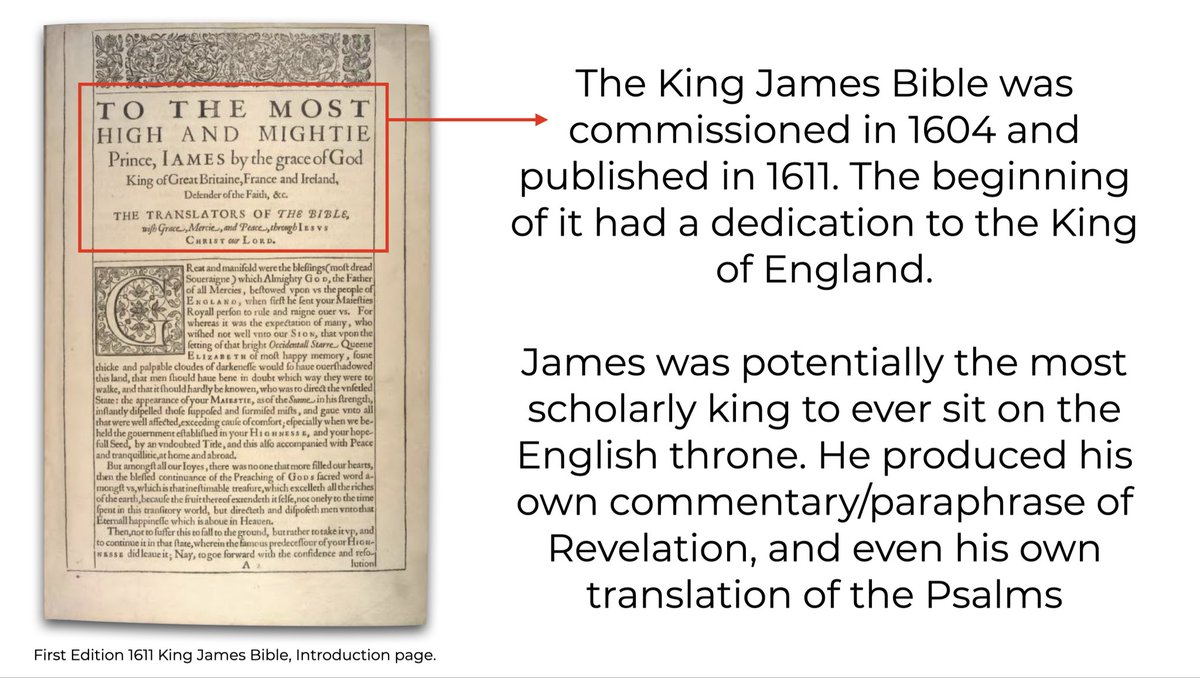 James was potentially the most scholarly king to ever sit on the English throne. He produced his own commentary/paraphrase of Revelation, and even his own translation of the Psalms.