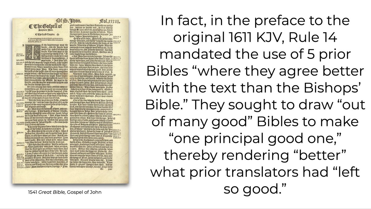 In fact, in the preface to the original 1611 KJV, Rule 14 mandated the use of 5 prior Bibles "where they agree better with the text than the Bishops' Bible." They sought to draw "out of many good" Bibles to make