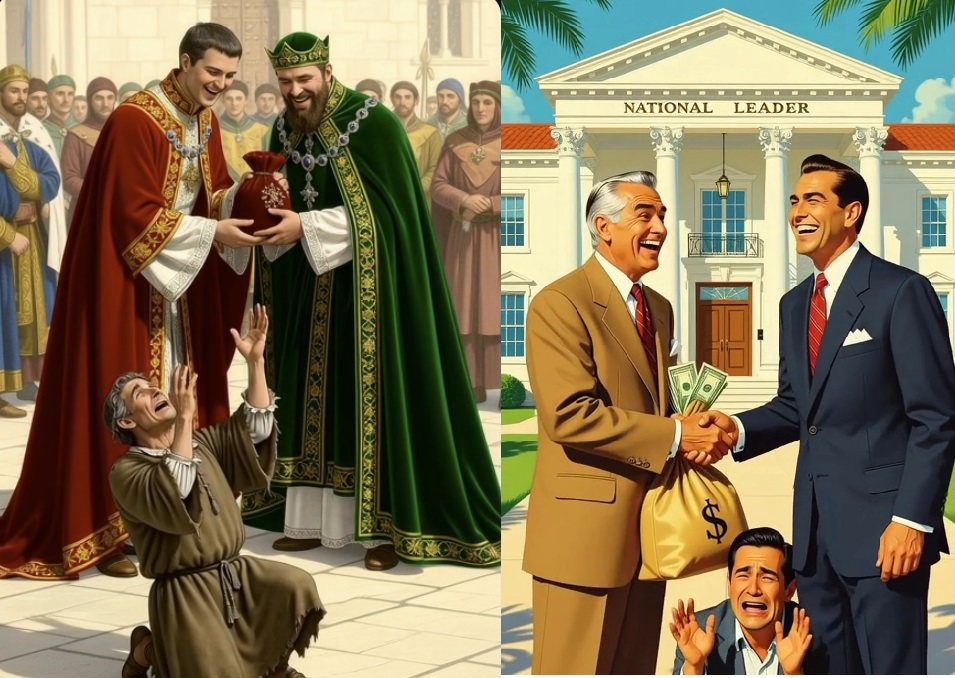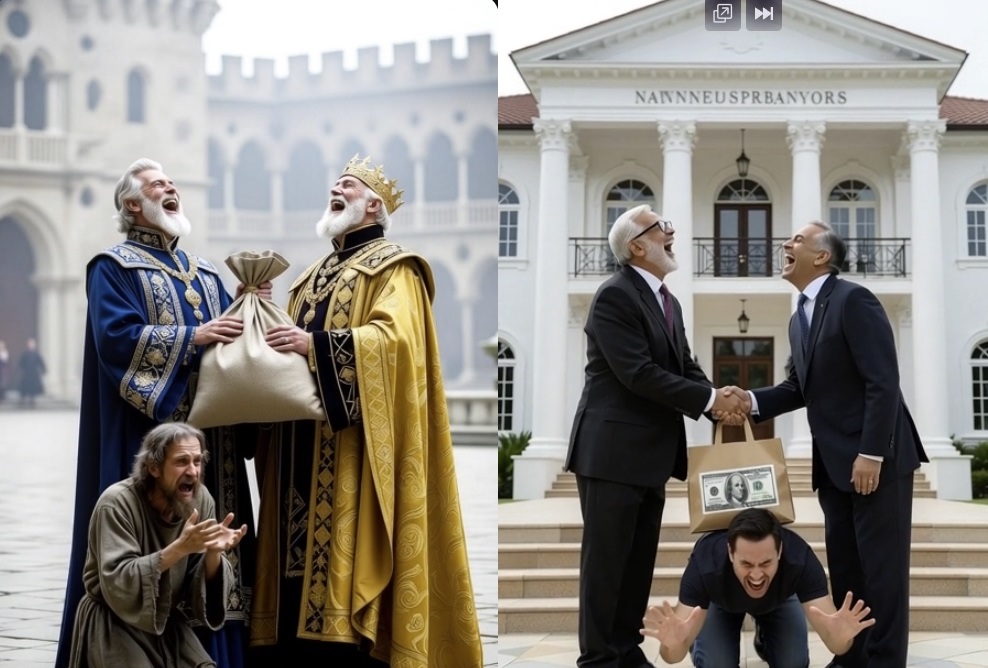 Picture the NATIONAL LEADER as handing off the tax money to the Noble Class Banking Family Representative this time.