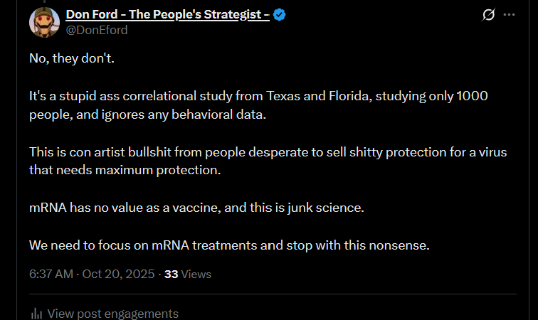 They blocked me for giving them a correct interpretation of a study of 1000 people in only Florida and Texas that claimed it improved cancer outcomes after getting mRNA.