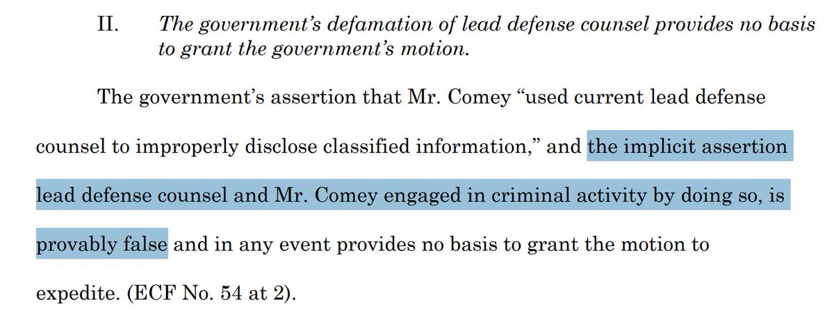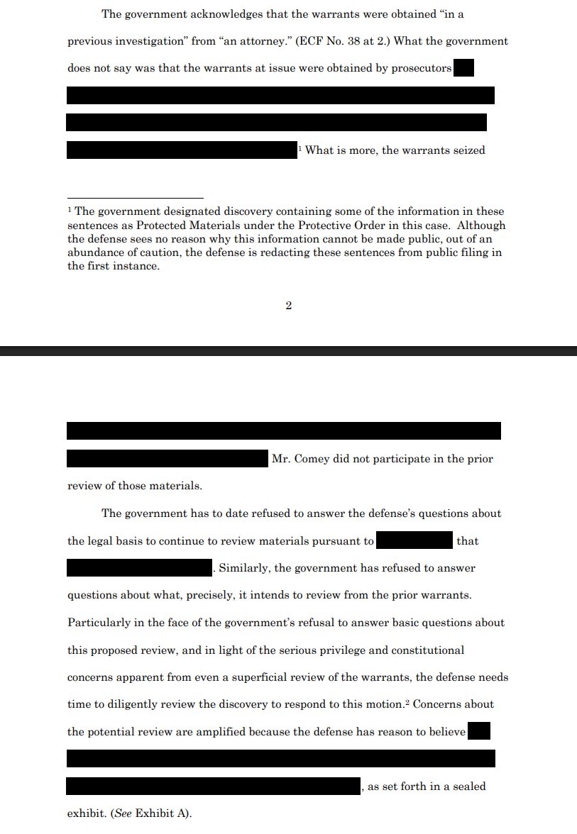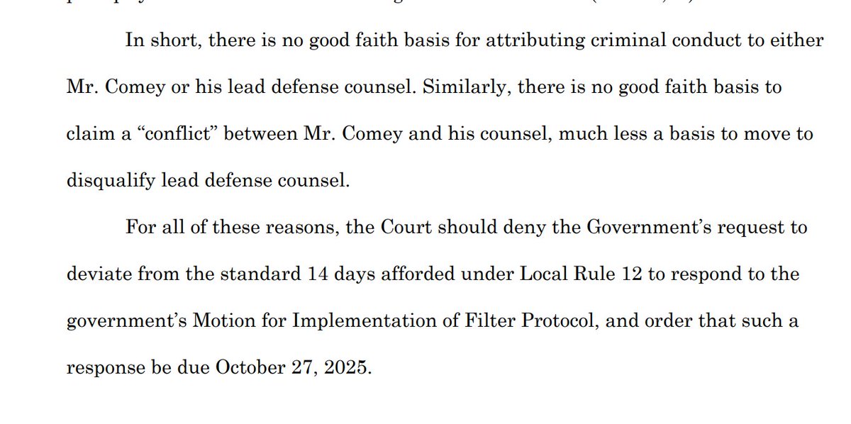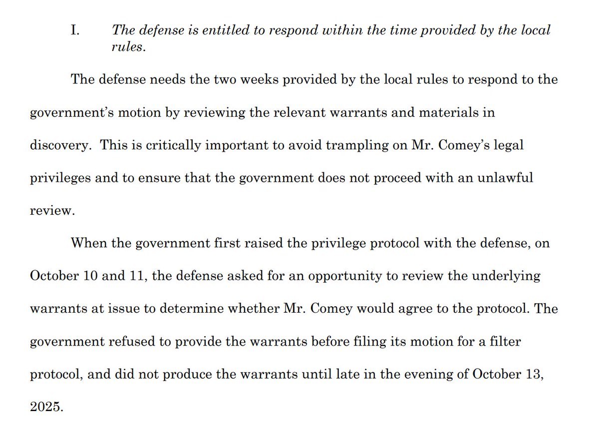 Comey responds to the prosecution's motion to hurry a decision on the filter team.