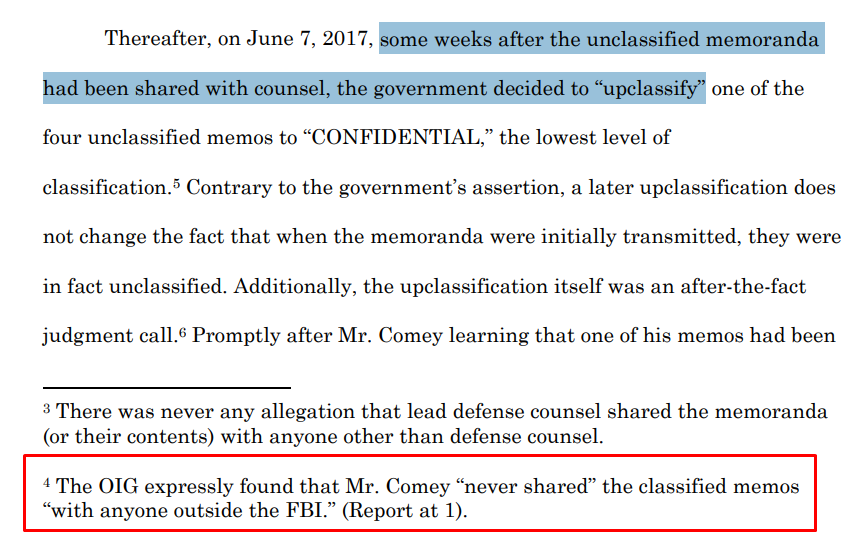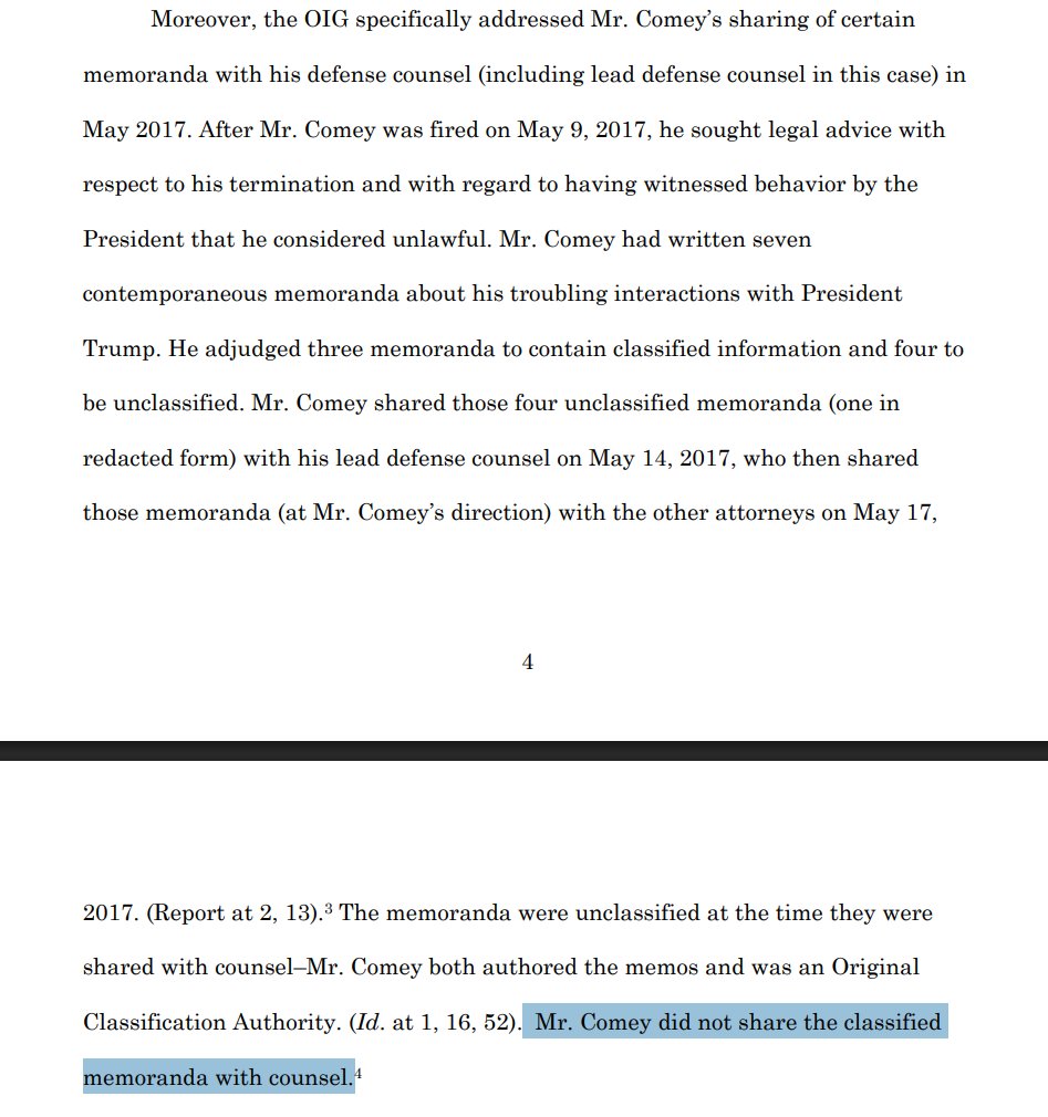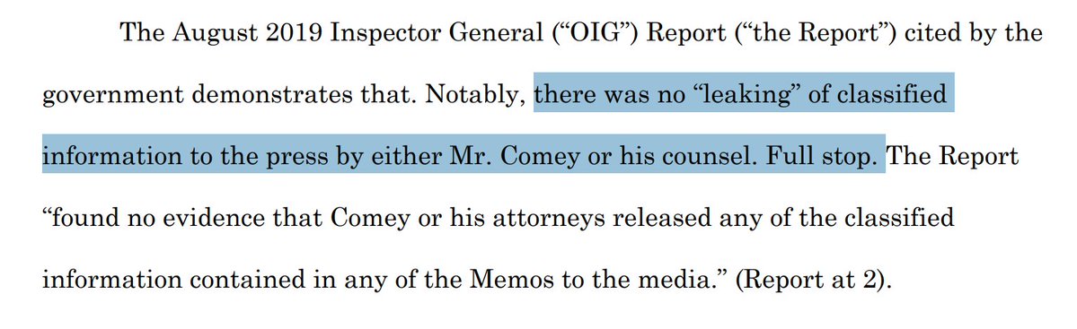 DOJ quotes from IG's report in their filing and notes that Comey used Fitzgerald to improperly disclose classified info.