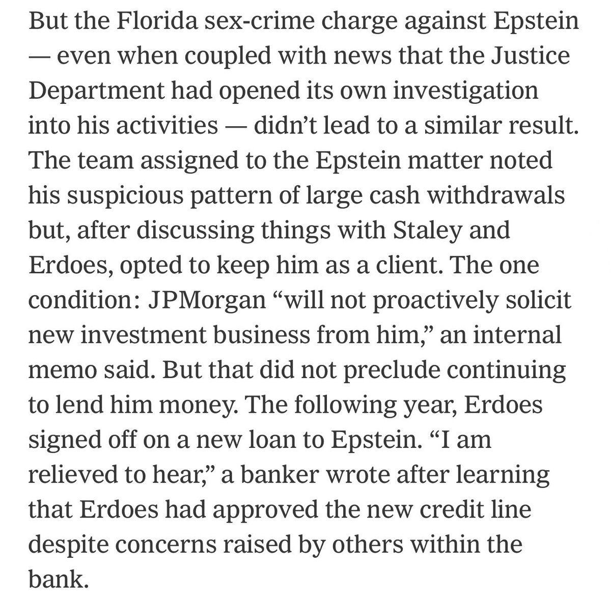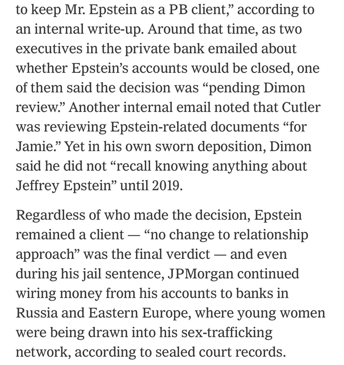 The American people deserve to know what JPMC’s role is here. Instead, Jamie Dimon blew off my questions, claiming that one employee was singlehandedly responsible for maintaining the bank’s ties to Epstein: finance.senate.gov/imo/media/doc/…