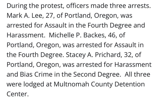 9 - Update: "@PortlandPolice arrested the pro-ICE woman who got punched by trans Antifa militant Michael “Michelle” Backes on hate crime charges. Authorities claimed the woman made physical contact with Backes who was harassing her with a makeshift LRAD system before she was punched. However, video evidence slowed down shows that Backes pulled the woman’s sweatshirt down and then threw a punch. The woman never touched him, but was arrested. Backes was also later taken into custody." - @KatieDaviscourt