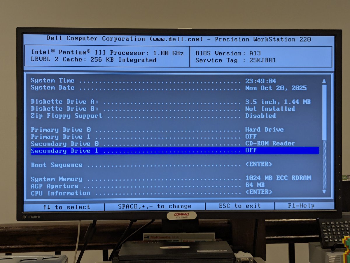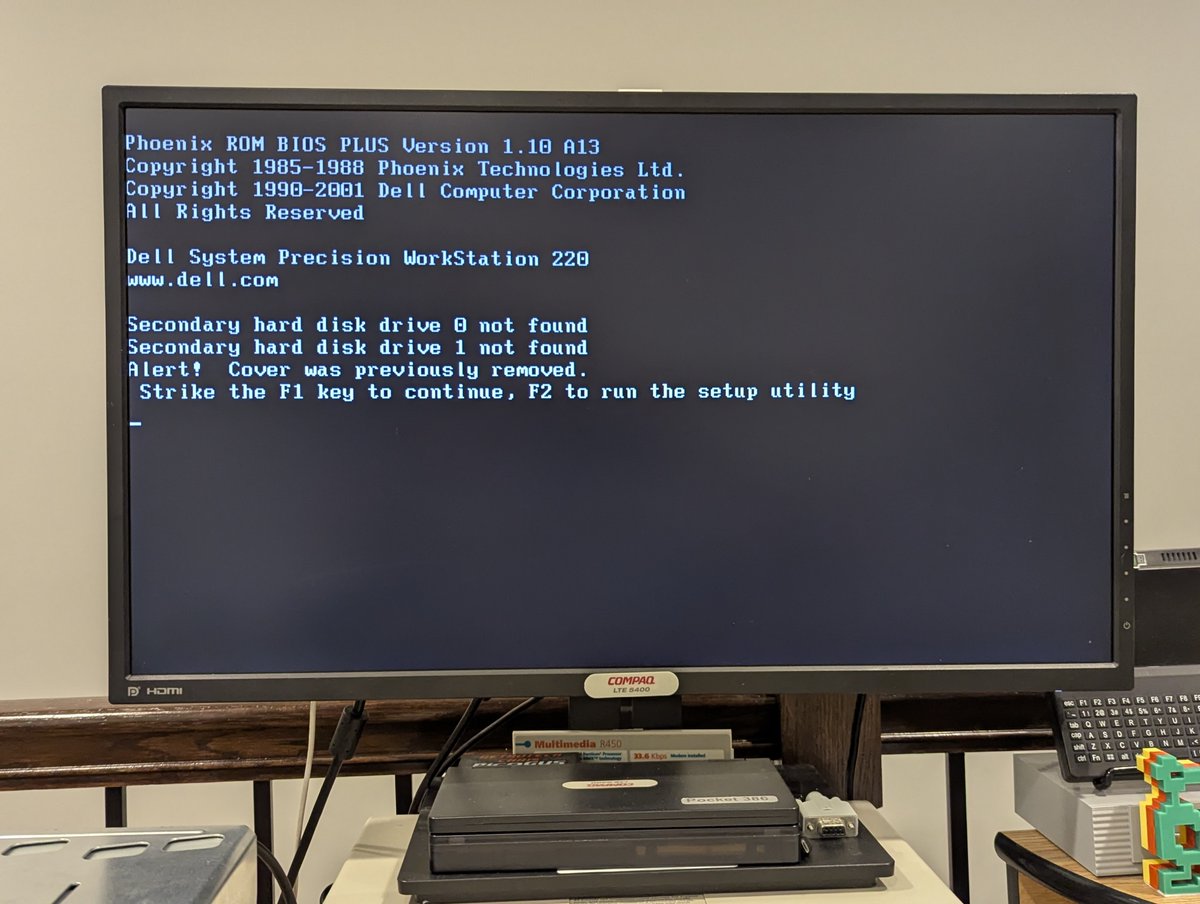 To get started, I decided to use the Dell Precision Workstation 220 to help with transferring data from the failing HDD to the new one since it was on the desk and is more accessible than the Compaq. We can see we have three HDDs detected (Dell, old Compaq, new Compaq). Good!