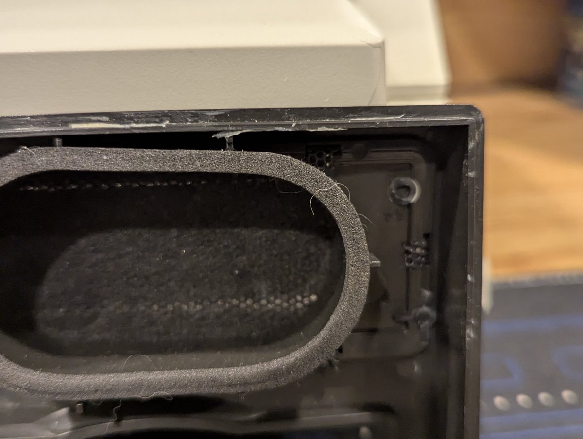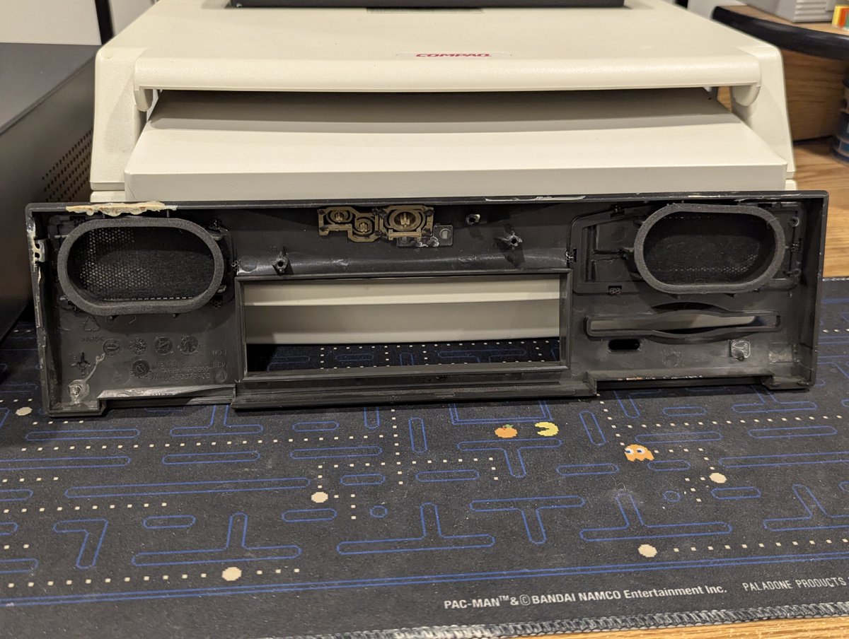 So, first, like 100% of these I have seen, the plastics in the front are very brittle. This front panel has previously been glued on, you can see some glue residue here and there!