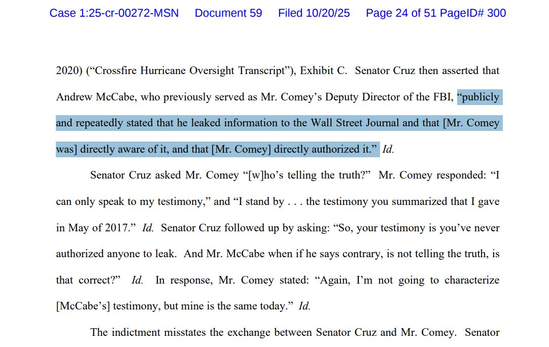 McCabe “publicly and repeatedly stated that he leaked information to the Wall Street Journal and that [Mr. Comey was] directly aware of it, and that [Mr. Comey] directly authorized it.”