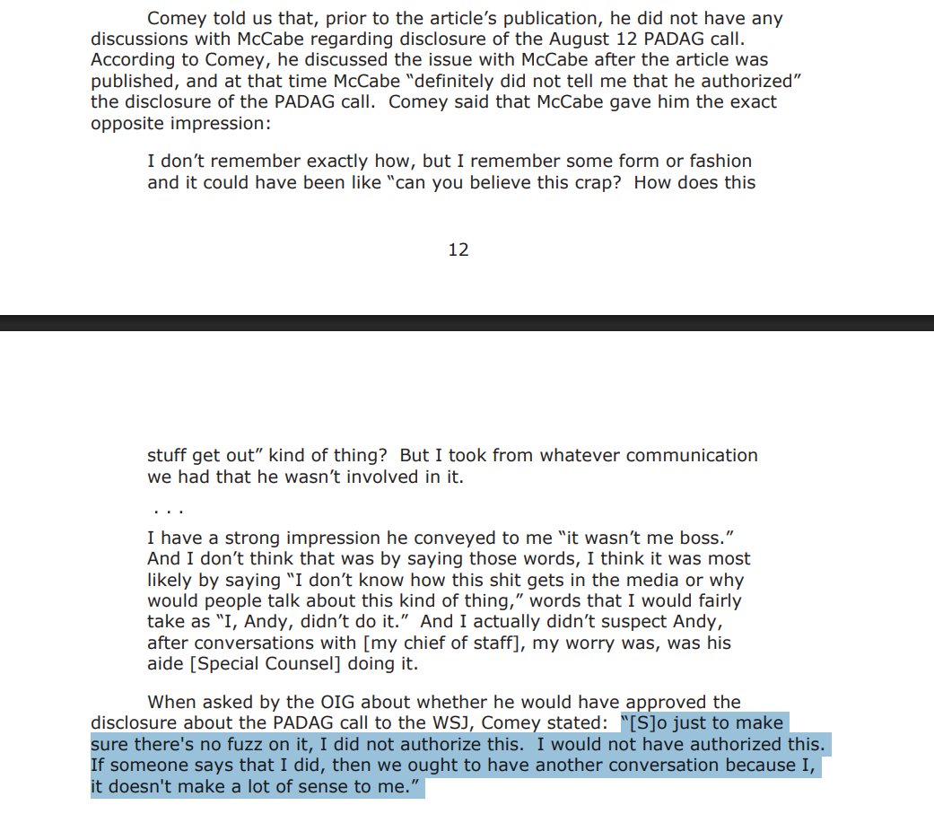 Comey told the Senators and IG Horowitz he did not authorize McCabe to leak to the media.