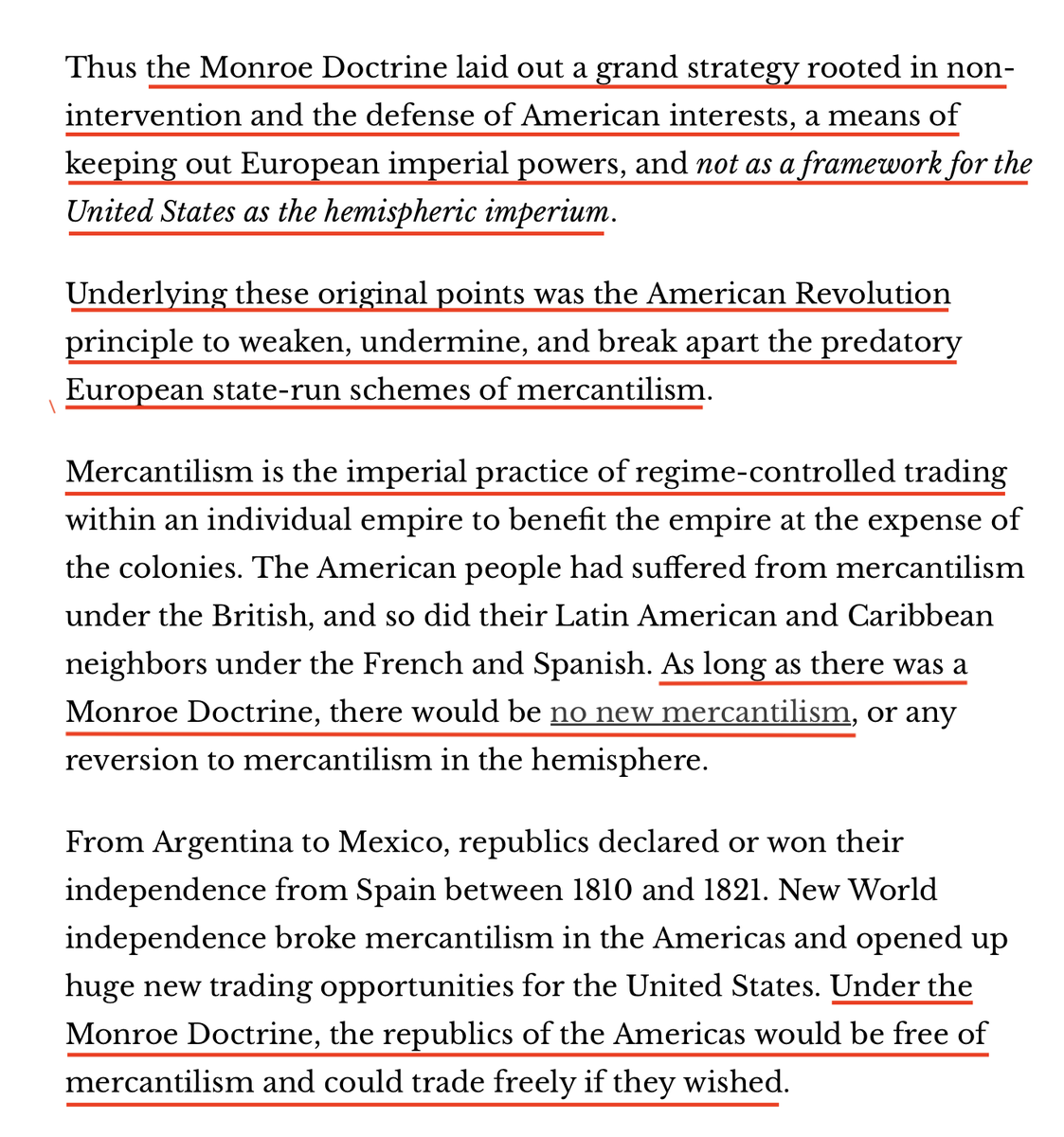The Monroe Doctrine rejected the imperial trading system of mercantilism. Back then, the great mercantilist empires were European, but it applies to Communist China today, with its Belt and Road Neo-mercantilist structures.