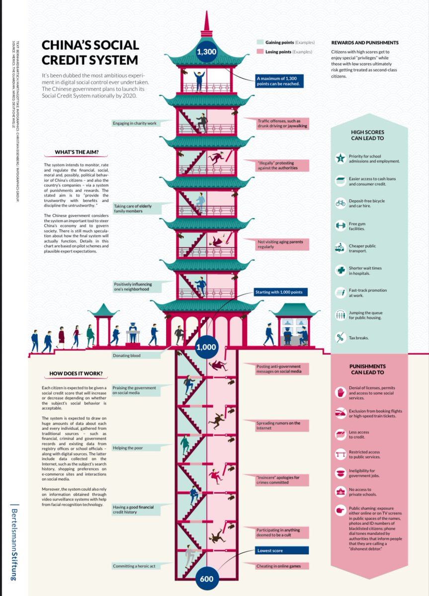 CHINA ’S SOCIAL CREDIT SYSTEM It’s been dubbed the most ambitious experi- ment in digital social control ever undertaken. The Chinese government plans to launch its Social Credit System nationally by 2020. Engaging in charity