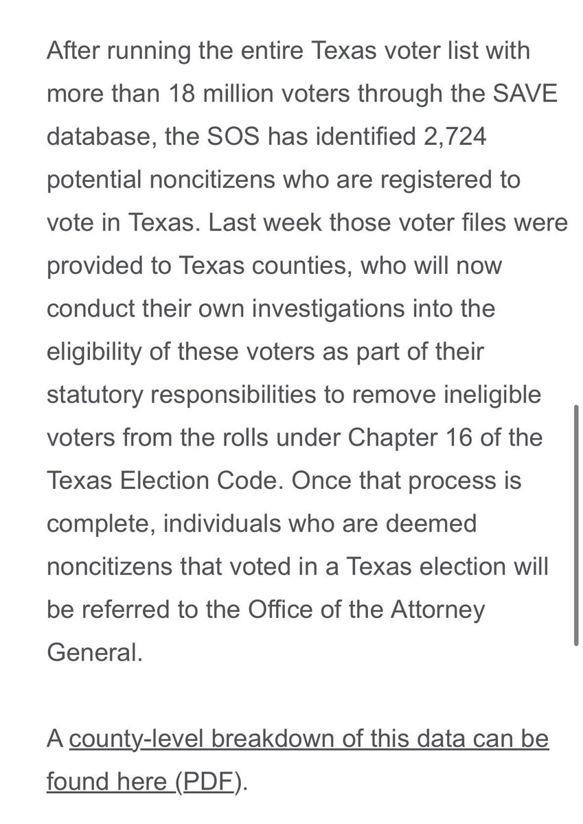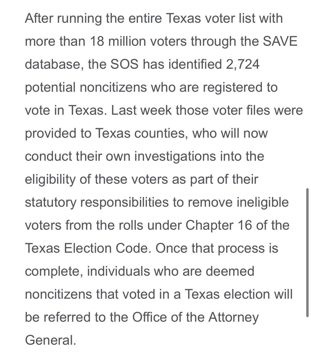 🚨This is FALSE. The characterization of this report is MADE UP. The Texas investigation found 2,274 “potential noncitizens” on the voter rolls out of over 18 million (0.01%).