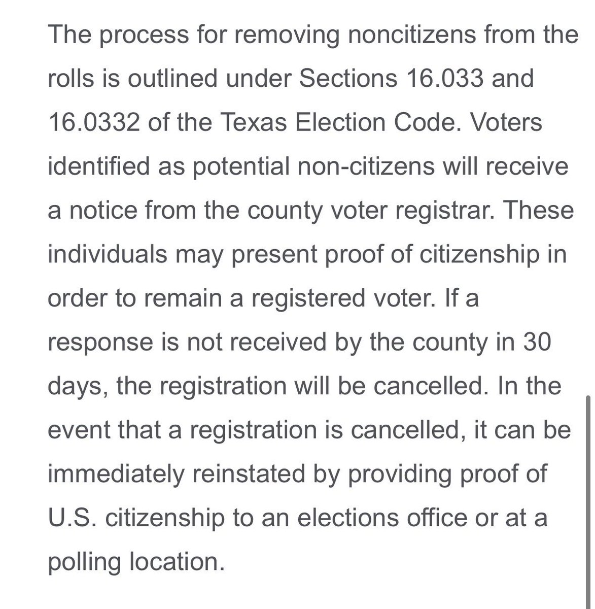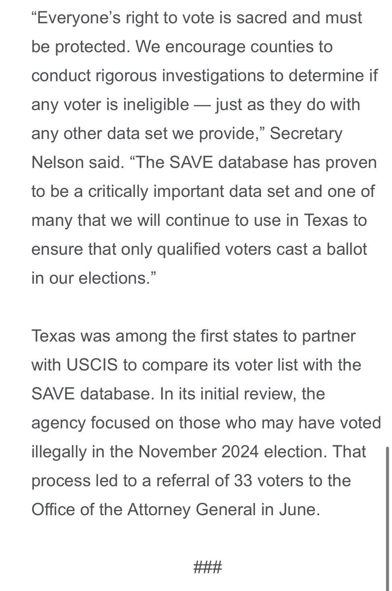 Here is the ENTIRE press release from the Texas Secretary of State. Note that AT NO POINT does she say that those flagged are “illegal immigrants.”