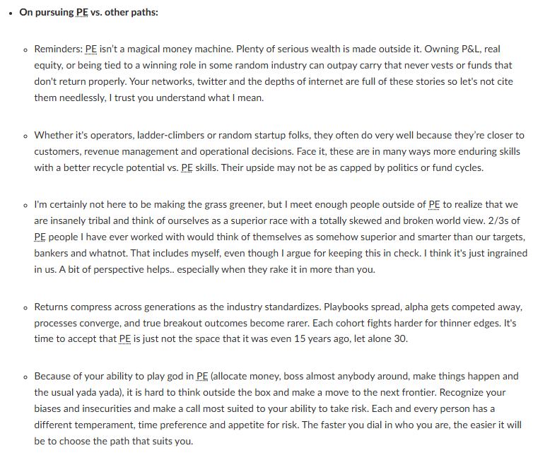 1) On pursuing PE vs. other paths 2) Good work ceases to be enough once you become seasoned — a web of relationships is more important 3) It's all just selling at the end of the day. Communication and charisma. 4) Don’t expect fairness. Respect the powers of collateral damage. 5) Founders, management and industry operators are sometimes very underrated 6) The myth of the mighty senior partner 7) Even PE work becomes just a people, projects and admin job after some years. 8) Don’t allow PE to be your main thing 9) You need to make some mistakes to learn from them. It probably won't make a difference that you read this post. 10) Careers are often made out of nothing, or everything 🧵