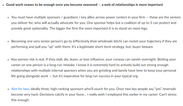 2) Good work ceases to be enough once you become seasoned — a web of relationships is more important