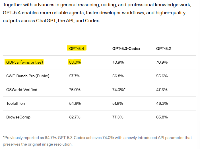GPT 5.4 is different: It has posted the highest score so far on GDPval (83%) which is a significant jump from GPT-5.2 (71%)