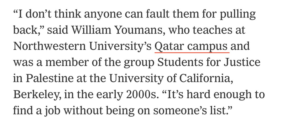 5/ LEFT: NYT quotes an academic from Northwestern’s Qatar campus–a former Students for Justice in Palestine member.