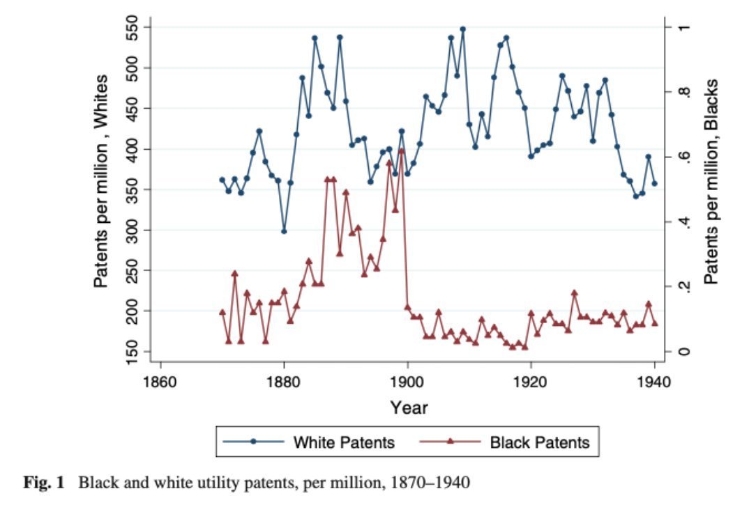 Later, The Brookings institute looked at the number of Black patents, and identified ~50,000 patents over this same period, instead of the 726. And they found no significant decline around year 1900, proving that this was just an artifact of her data set.