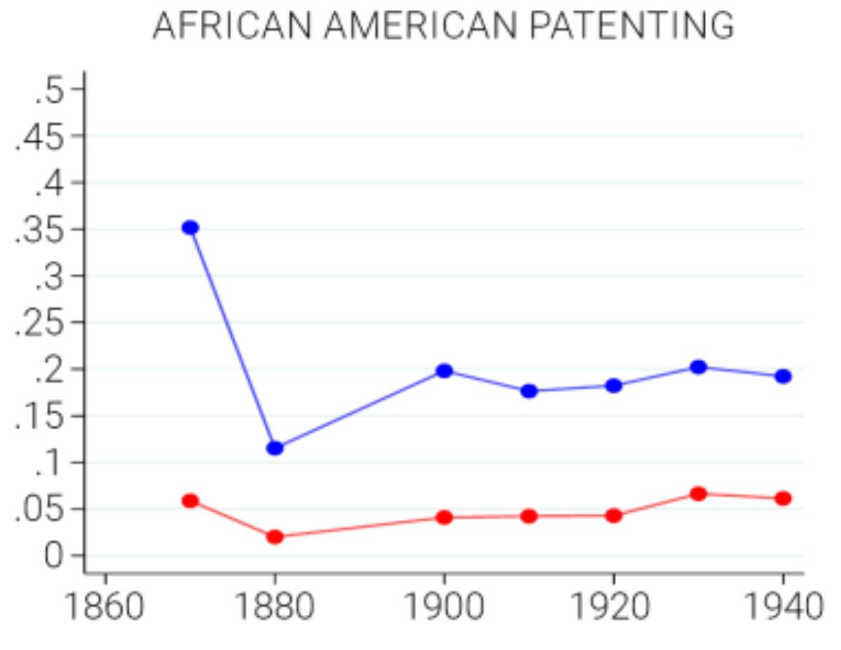 And here is data from the Brookings Institute, identifying 50,000 patents, showing that there was in fact no real decline in Black patents in the year 1900 (red line).