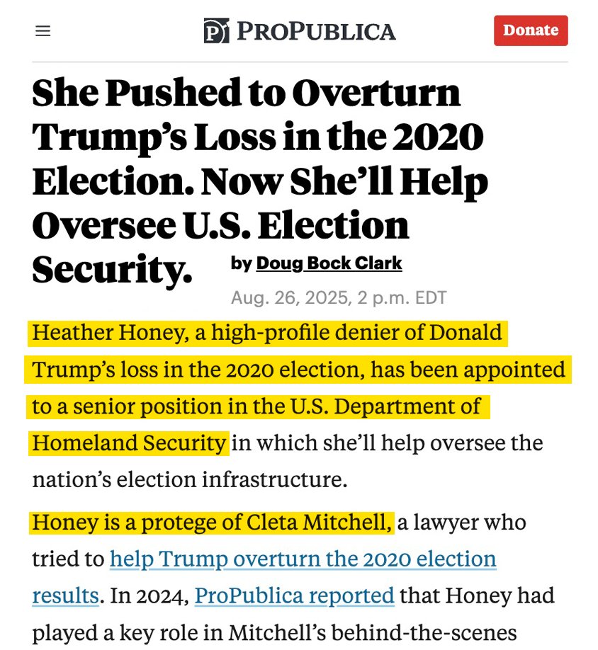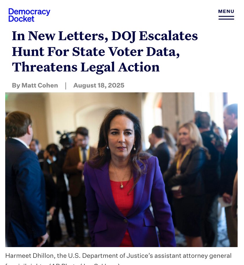 The DOJ is collecting massive voter roll data, DHS is pressuring states to upload files, and Honey is spreading false claims and framing the directives as “best practices.”