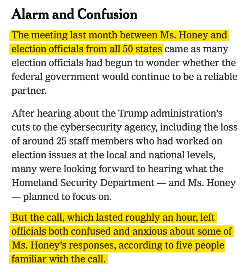 Heather Honey (Trump DHS appointee) floated using national emergency powers to mandate election rules for states as early as March.