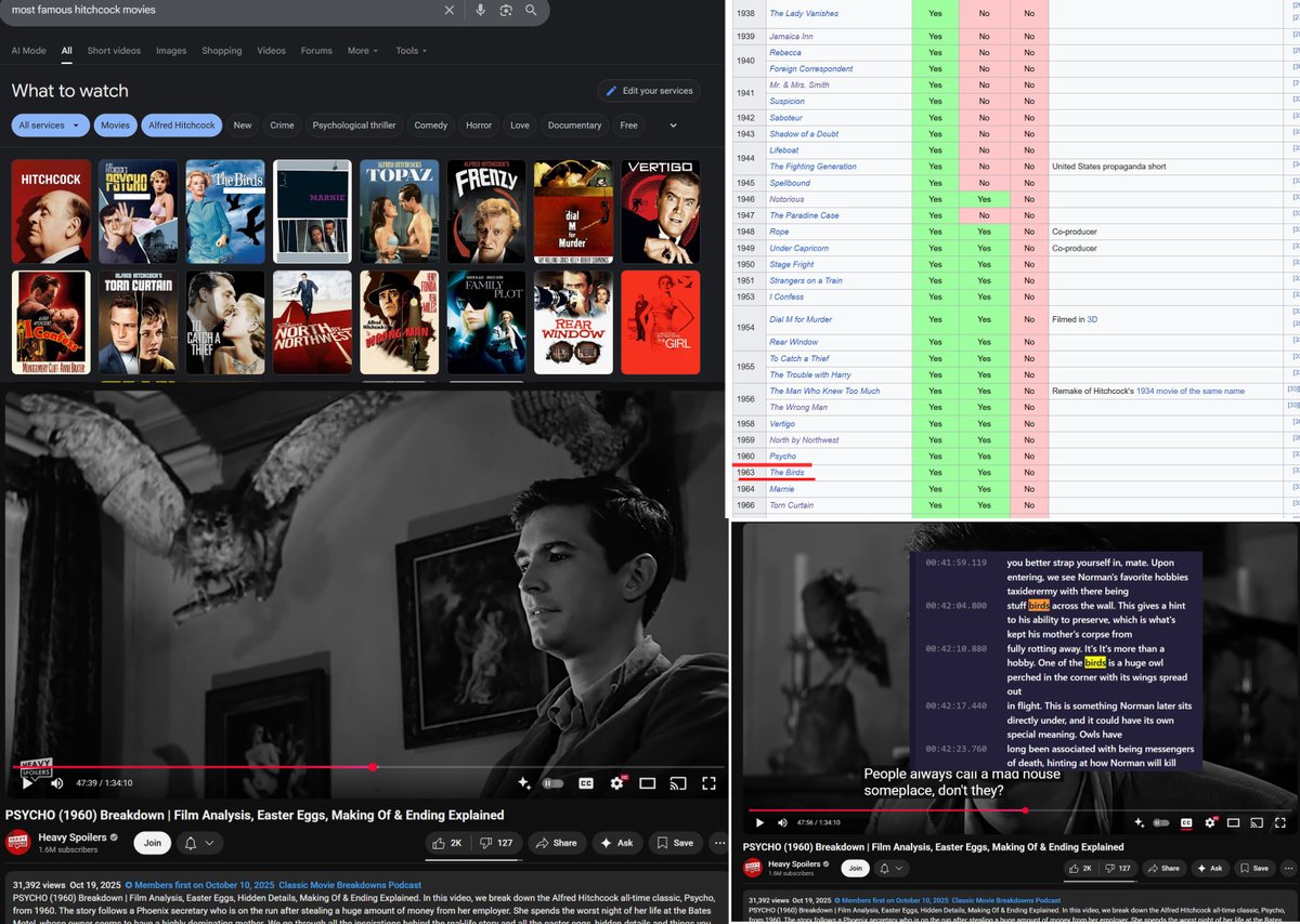 Psycho & The Birds Decoding 1. Look up famous Hitchcock films and the first two that come up are "Psycho" and "The Birds". He filmed both films back-to-back and there is a strange focus on taxidermy birds in Psycho.