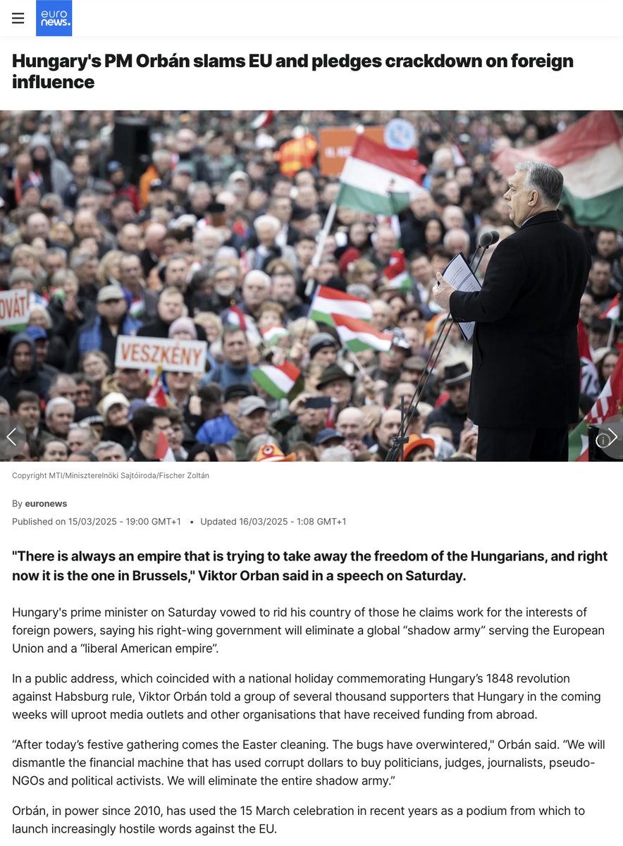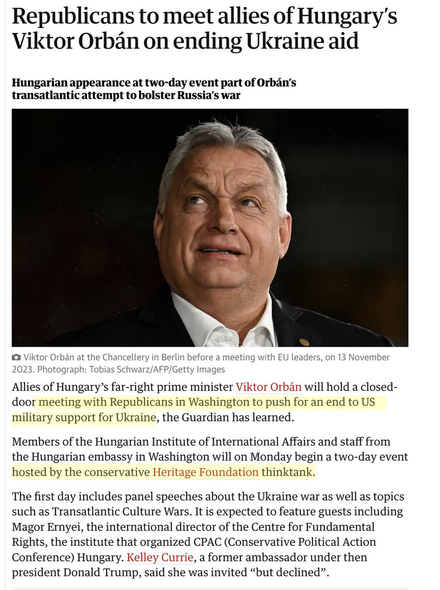 Il est plus surprenant que l’entourage « MAGA » de Trump soit, lui aussi, séduit par le modèle de gouvernance autoritarisme-corruption-pauvreté. Mais il est en réalité relié à Orbán à travers la famille Carlson, le think tank Heritage et la CPAC.