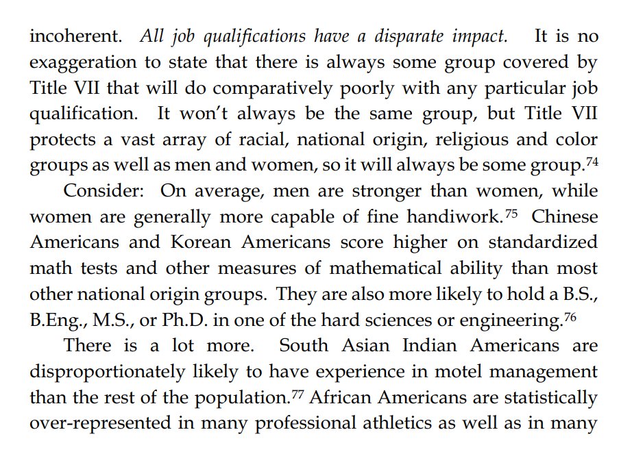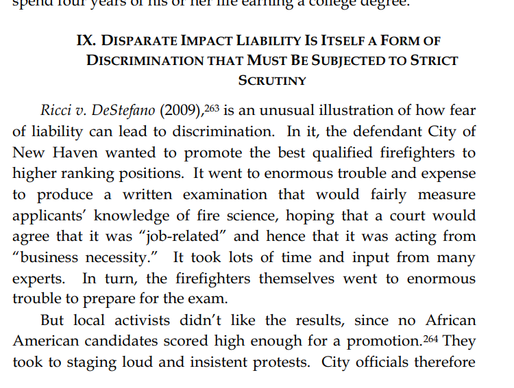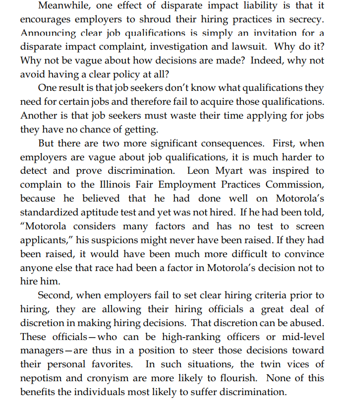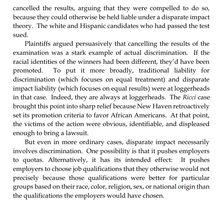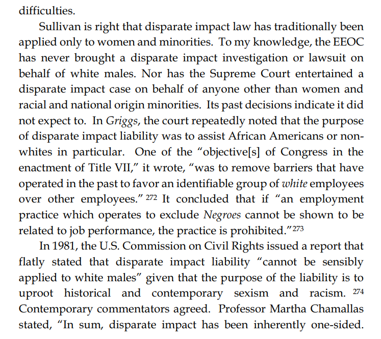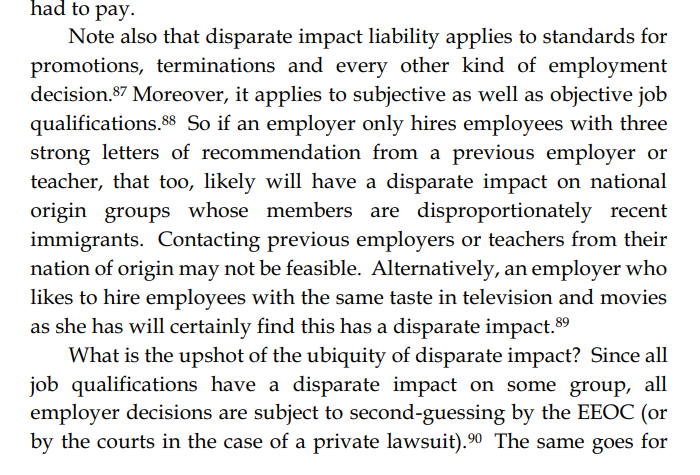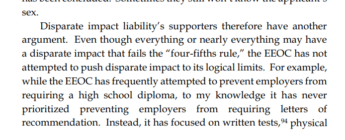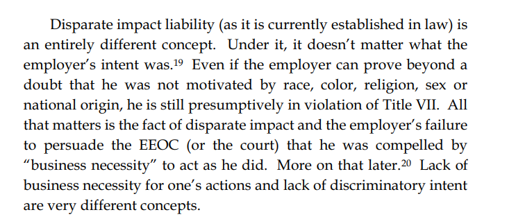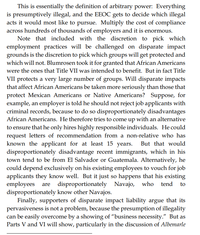 Thread with excerpts from Gail Heriot's "Title VII Disparate Impact Liability Makes Almost Everything Presumptively Illegal". The argument is very simple: everything has disparate impact; therefore disparate impact doctrine gives the EEOC effectively unlimited arbitrary power.