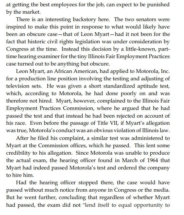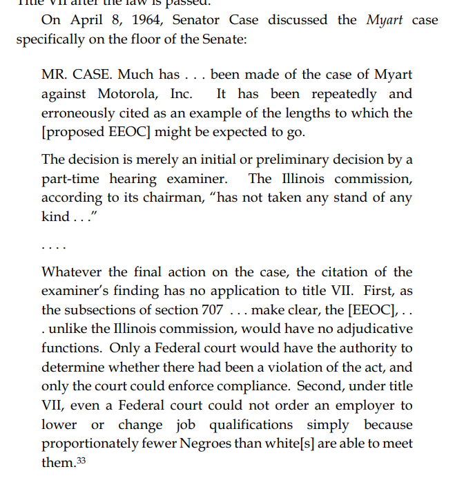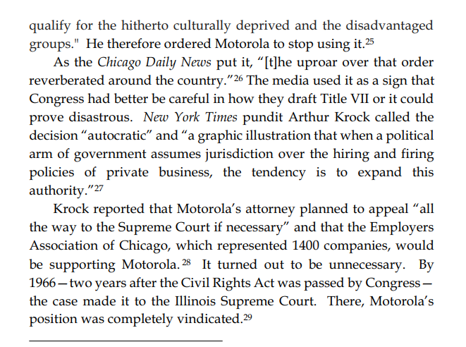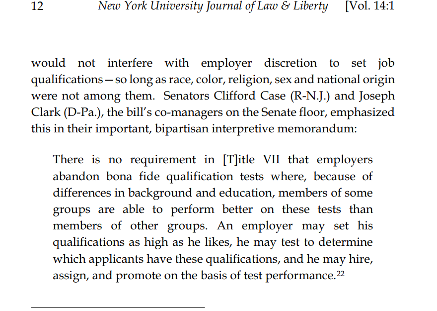 These legislators made their intent explicit because of a pre-Civil Rights Act of 1964 court case which found that Motorola could not use a standardized test because it was used to avoid hiring a black applicant, which was seen as tyrannical overreach at the time.
