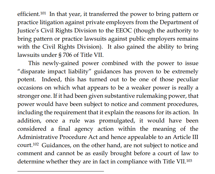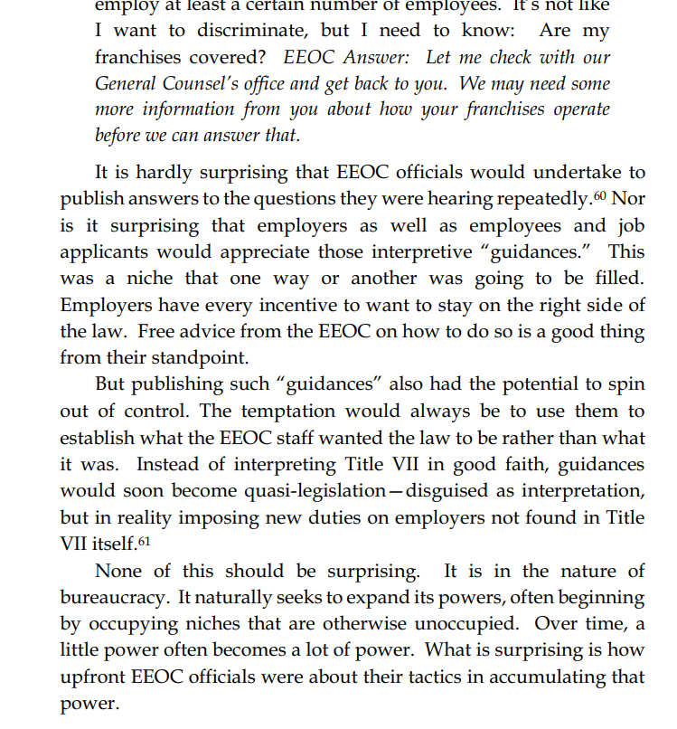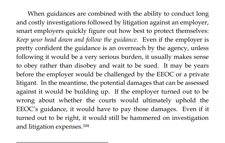 The EEOC began by issuing "guidance" on how to interpret the law to concerned employers worried they might be in violation. This guidance quickly ceased to be made in good faith and became a form of quasi-law with the explicit goal of power accumulation.