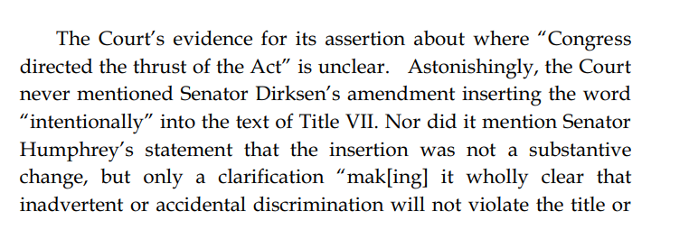 tl;dr: CRA of 1964 was egregiously misinterpreted by the EEOC and Supreme Court to mean the opposite of the text. The CRA of 1991, on the other hand, partly canonized that interpretation. Fire should be focused on that one (which, conveniently, is also much less sacred).