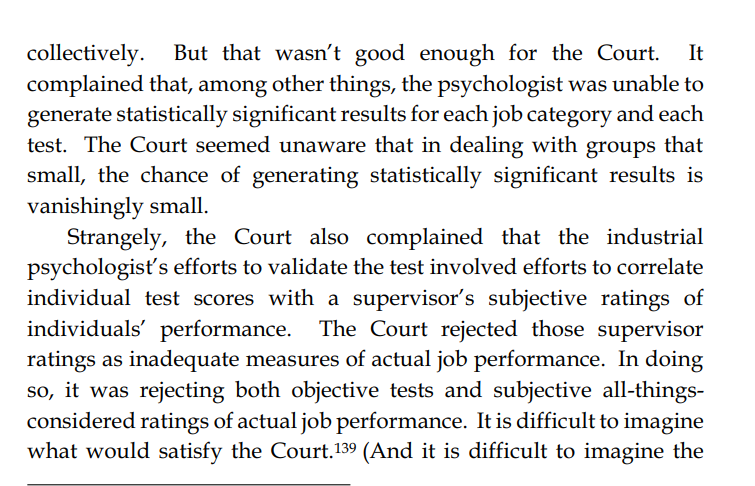 Another court case (Albemarle) ruled against paper-and-pencil tests because the Supreme Court apparently didn't understand statistical significance, and why showing it is difficult with tiny sample sizes, and also banned both objective and subjective measures of performance.