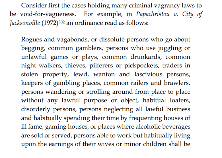 Separate issue, mentioned because it covers the question of vagueness, but before the 1970s Supreme Court decisions, vagrancy laws were commonplace.