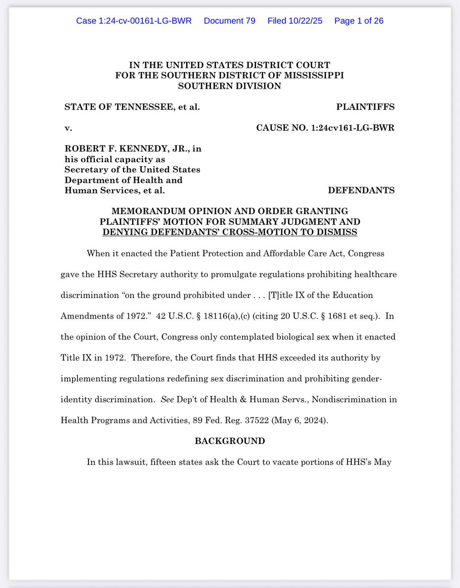 2/ The court disagreed with the Biden HHS that the Supreme Court’s reasoning in Bostock v. Clayton Country (2020) requires interpreting Title IX (imported into 1557) to mean that sex = gender identity.