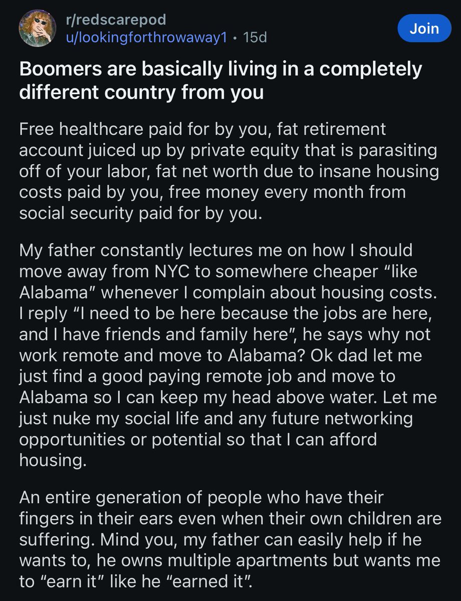 Boomers are never going to listen to "evidence" because the status quo extracts wealth from the young and gives it to geriatrics. Asset inflation enriches old people at the expense of the young. It's more convenient to believe the young are lazy and morally inferior.