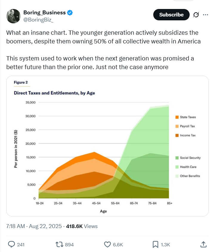 Boomers will just sit on their assets for 30 years at a time, living on the annual interest of their assets. This locks out capital formation for young people, small businesses, and kills the investment cycle that drives the economy.