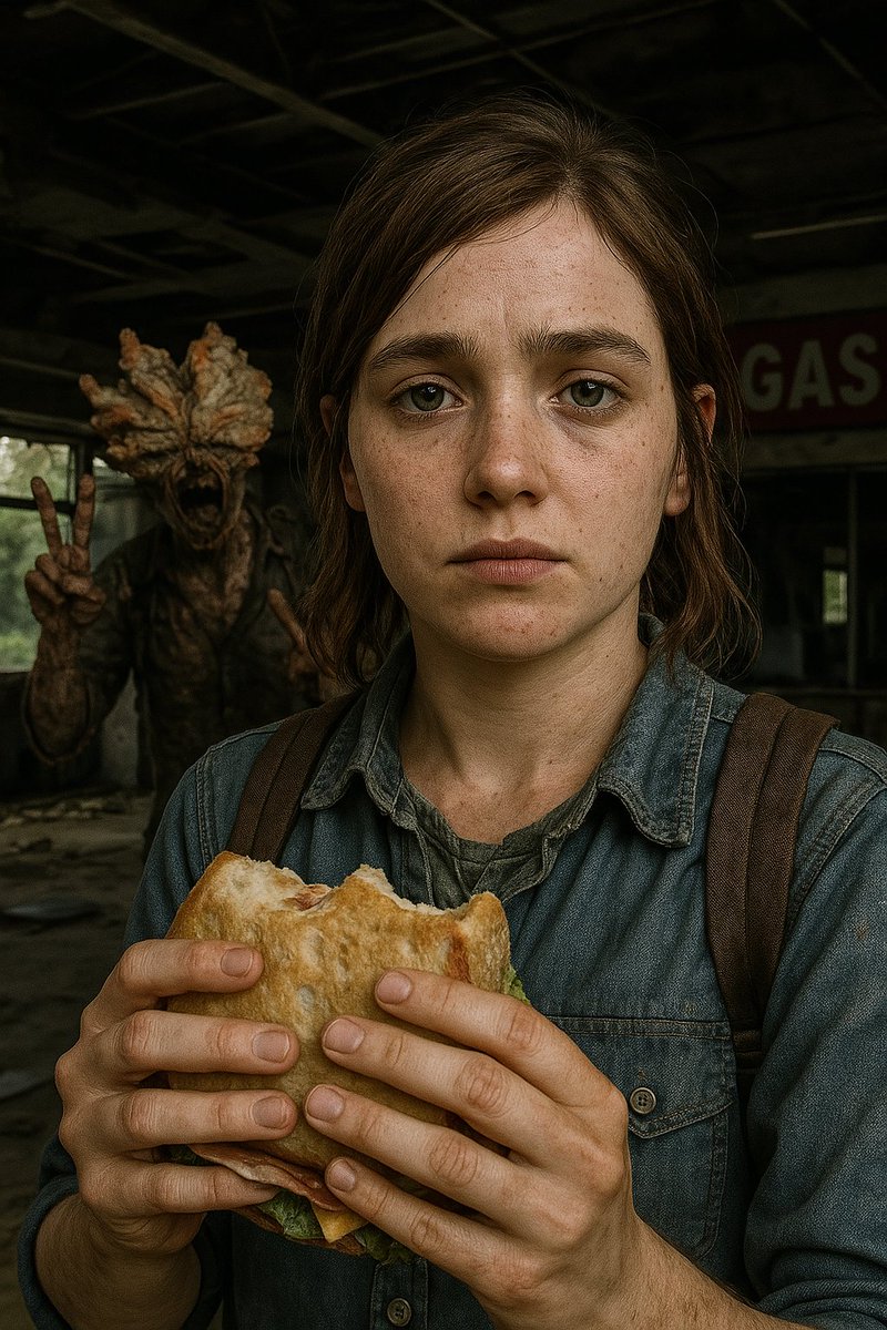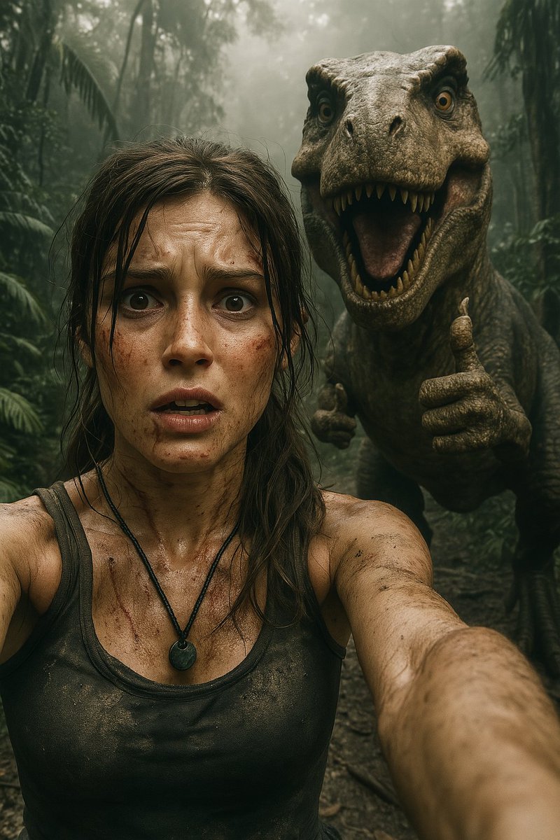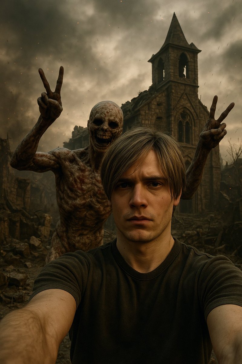 An extremely unremarkable iPhone selfie photo. It’s of [Main Character] from [Franchise/Game/Movie], standing in [Setting], looking [expression or mood]. Behind them, [Iconic Creature/Enemy/Character] is [doing something absurd or playful]. Hyper realistic, cinematic chaos, like a viral photo captured at the worst possible moment.