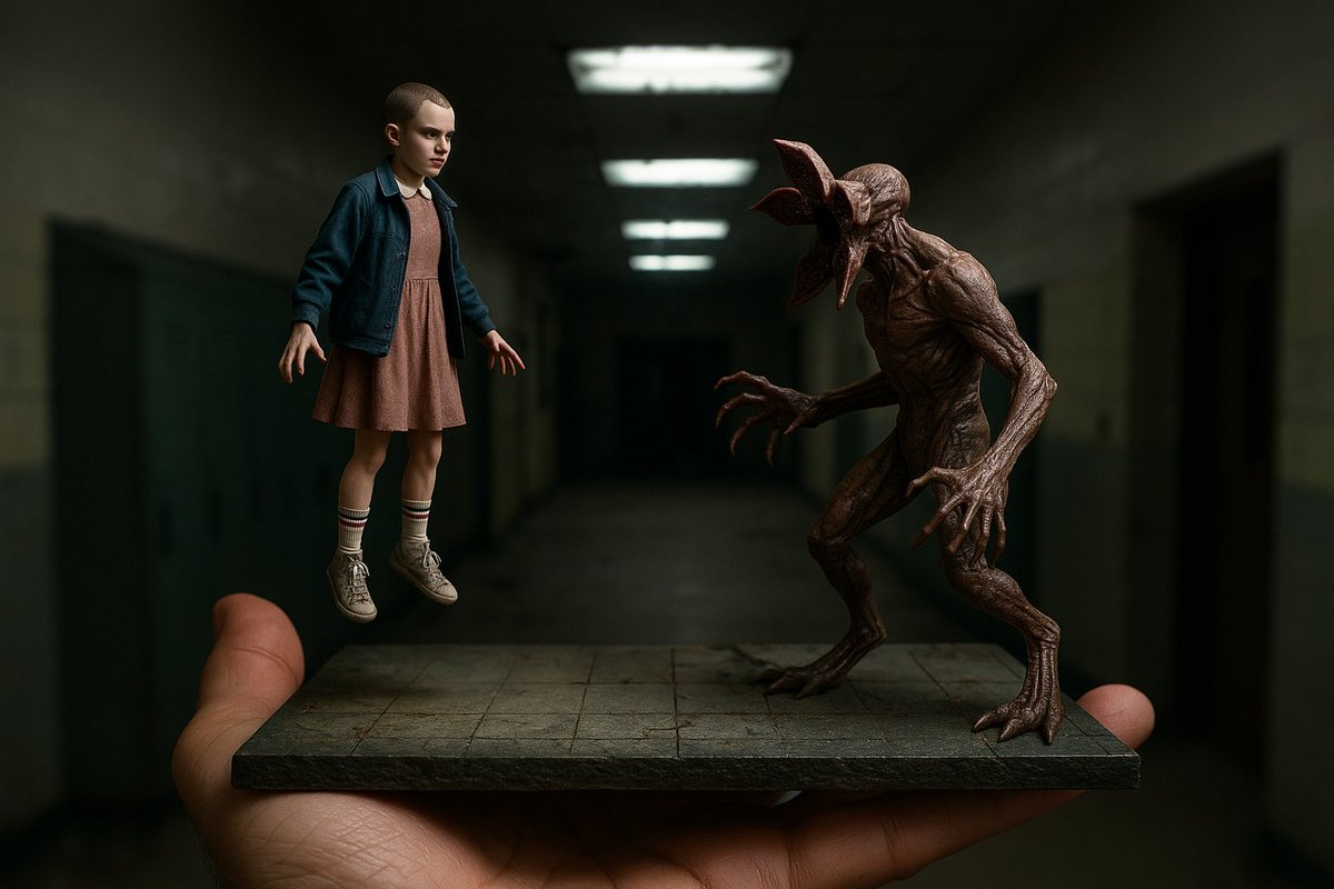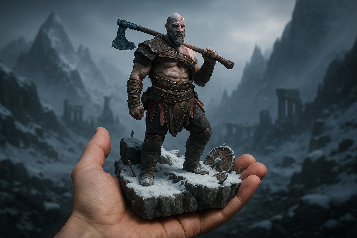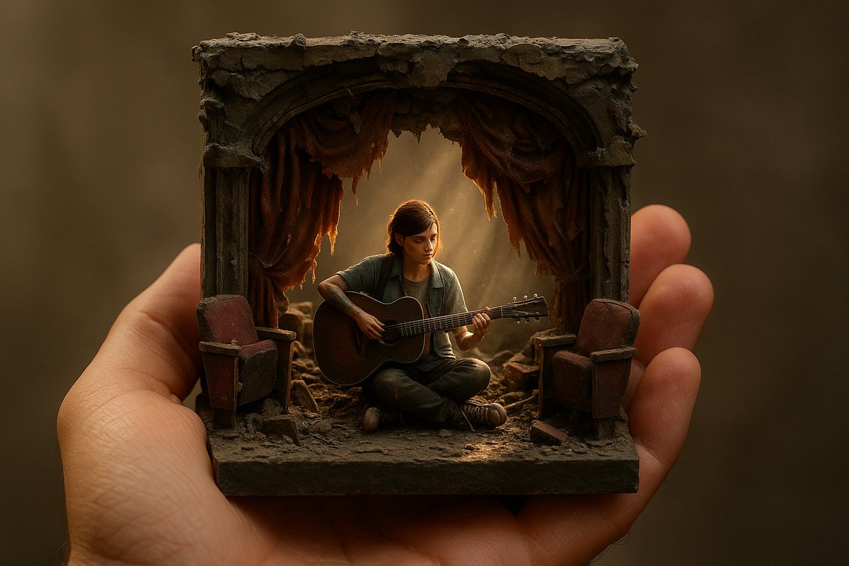 A realistic photo showing a hand holding a miniature 3D diorama of [character/event] from [franchise or real-life concert/show/movie/game]. The diorama features [describe pose or action], with [background ]. hyper-realistic, cinematic